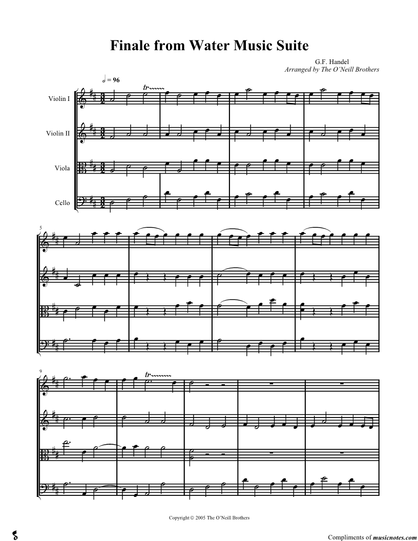 Violin 1, range: F#4-D6 Violin 2, range: C#4-F#5 Viola, range: A3-E5 Cello, range: D2-F#4 | |