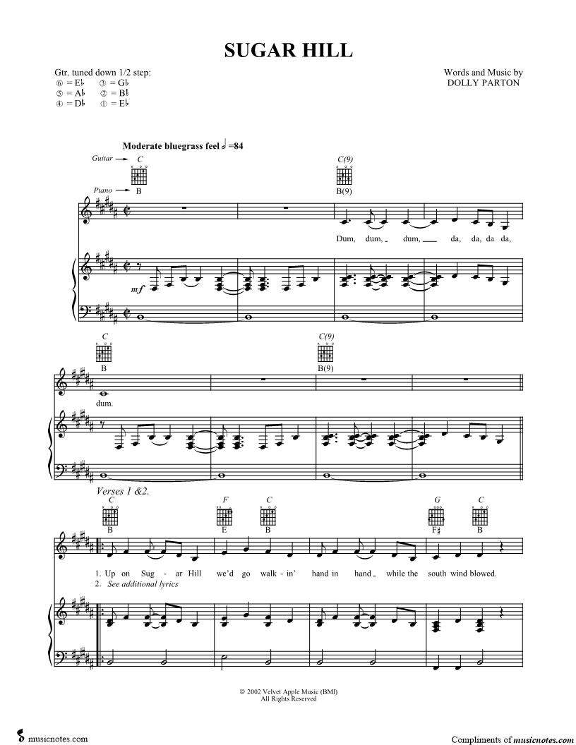 Dum, dum, dum, da, da, da da, dum. Up on Sugar Hill we'd go walkin' hand in hand while the south wind blowed. |