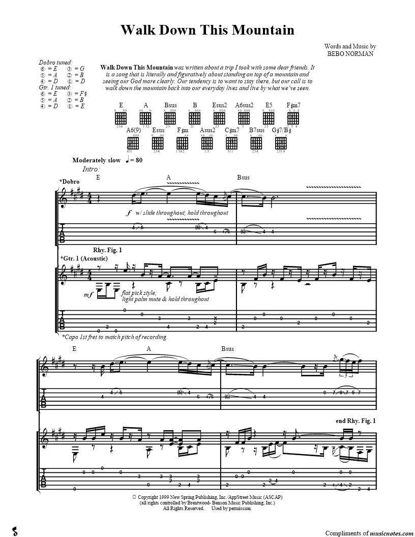 Voice, range: A3-E5 Guitar 1, range: E3-B5 Guitar 2, range: E3-B5 or Dobro Backup Vocals Strum Dobro | |