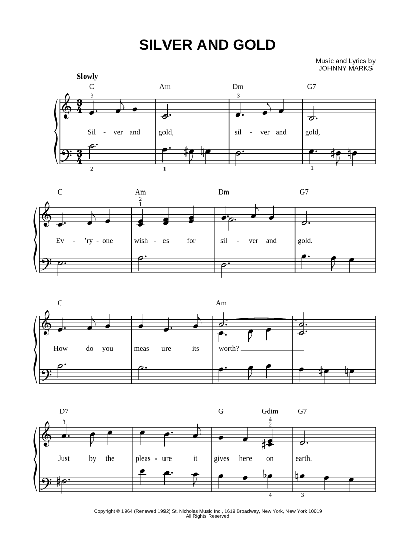 Silver and gold, silver and gold, ev'ryone wishes for silver and gold. |