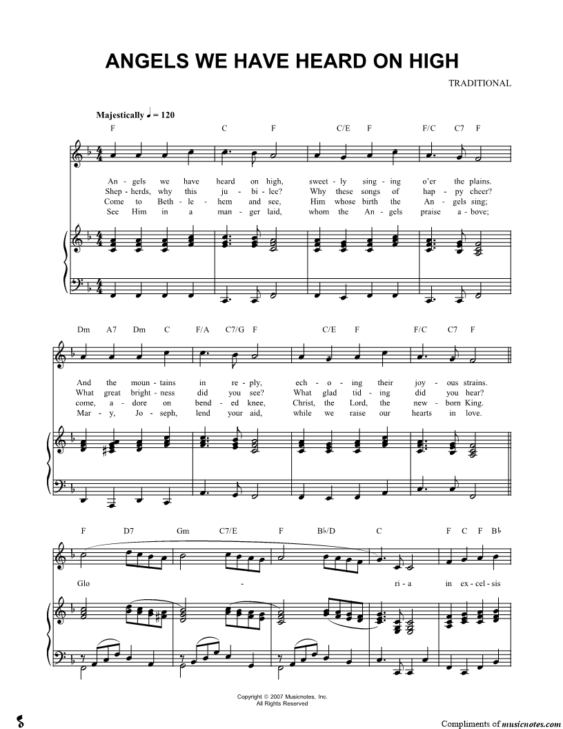 Angels we have heard on high, sweetly singing o'er the plains. |