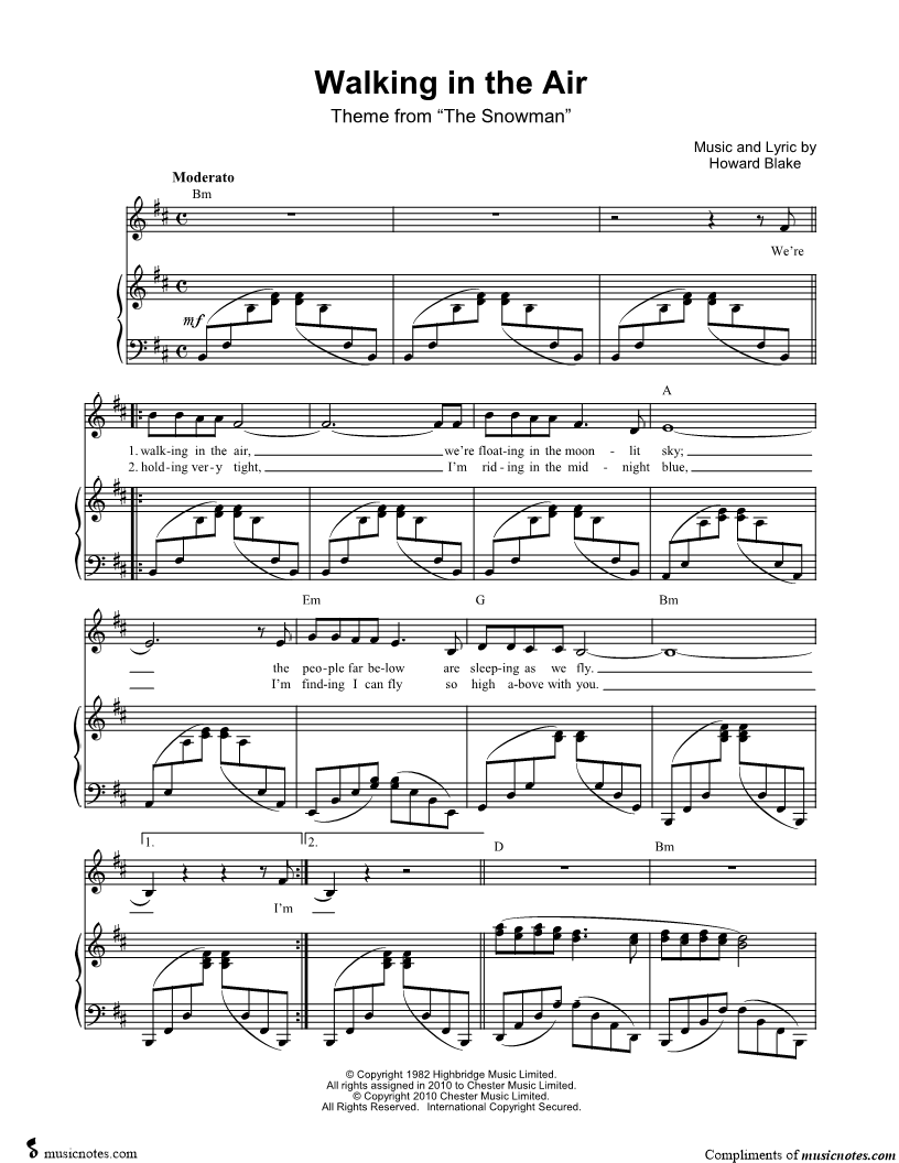 We're walking in the air, we're floating in the moonlit sky; the people far below are sleeping as we fly. |