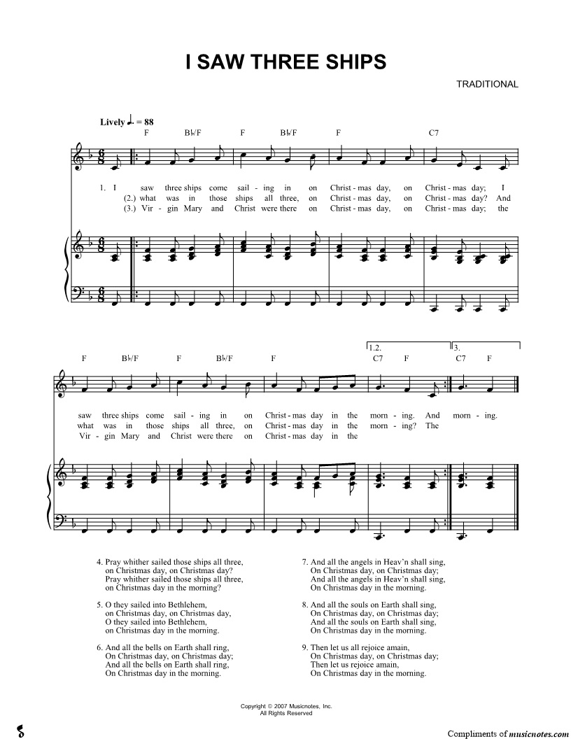 I saw three ships come sailing in on Christmas day, on Christmas day; |