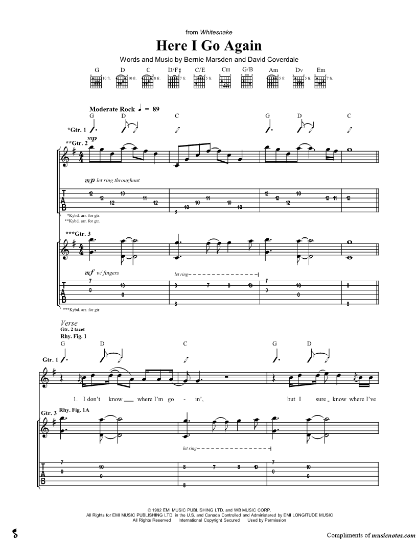 Voice, range: B3-F#6 Guitar 1, range: E3-G7 Guitar 2, range: E3-C6 Guitar 3 Guitar 4 Guitar 5 Guitar 6 Guitar 7 Backup Vocals Strum | |