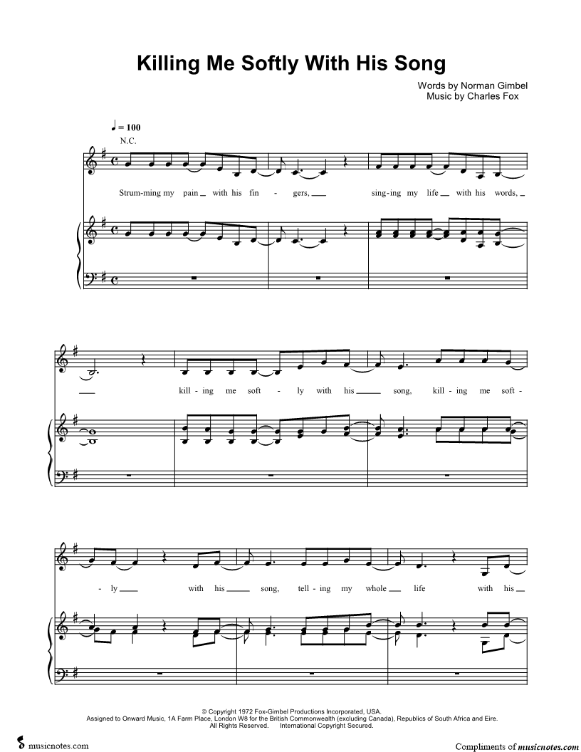 Strumming my pain with his fingers, singing my life with his words, killing me softly with his song, killing me softly with his song, |
