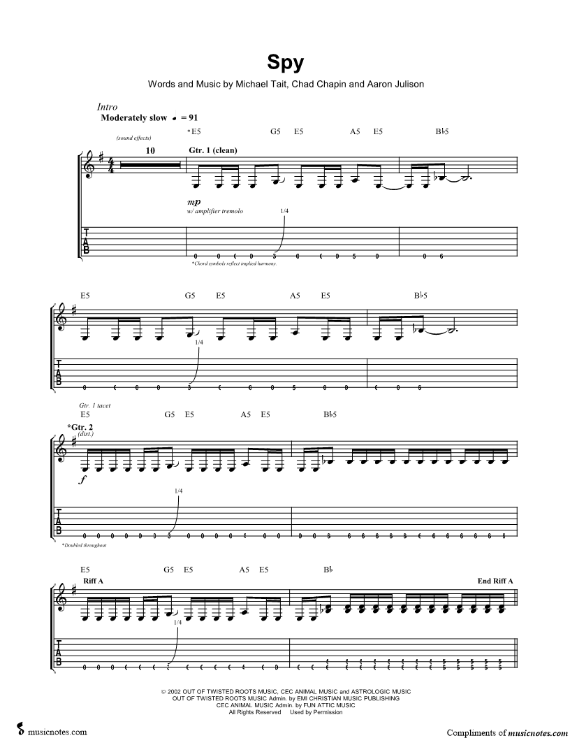 Voice, range: A3-B5 Guitar 1, range: E3-F#6 Guitar 2, range: E3-G4 Guitar 3, range: C3-C4 Guitar 4, range: E3-E4 Guitar 5, range: C3-C4 Backup Vocals | |