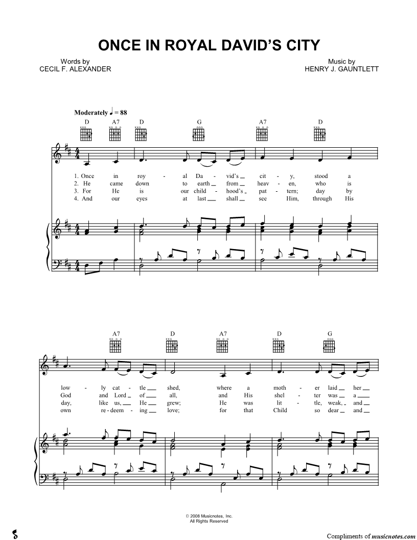 Once in royal David's city, stood a lowly cattle shed, where a mother laid her Baby, in a manger for His bed Mary was that Mother mild, |