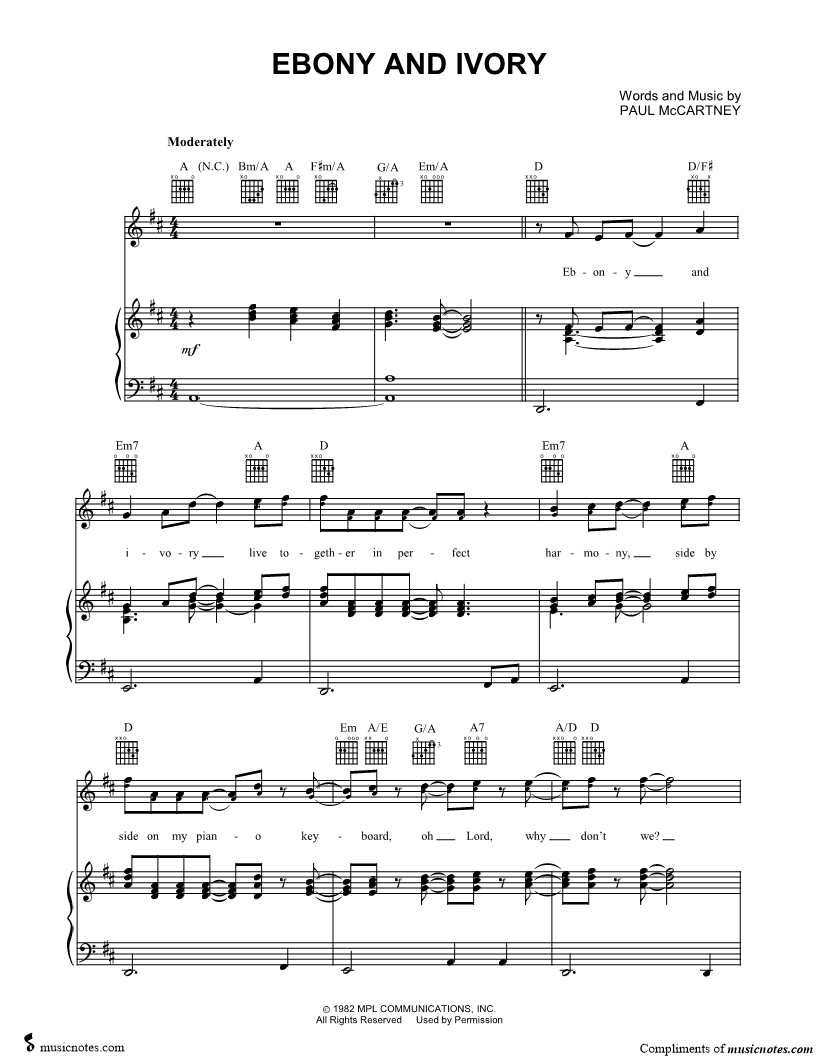 Ebony and ivory live together in perfect harmony, side by side on my piano keyboard, oh Lord, why don't we? |