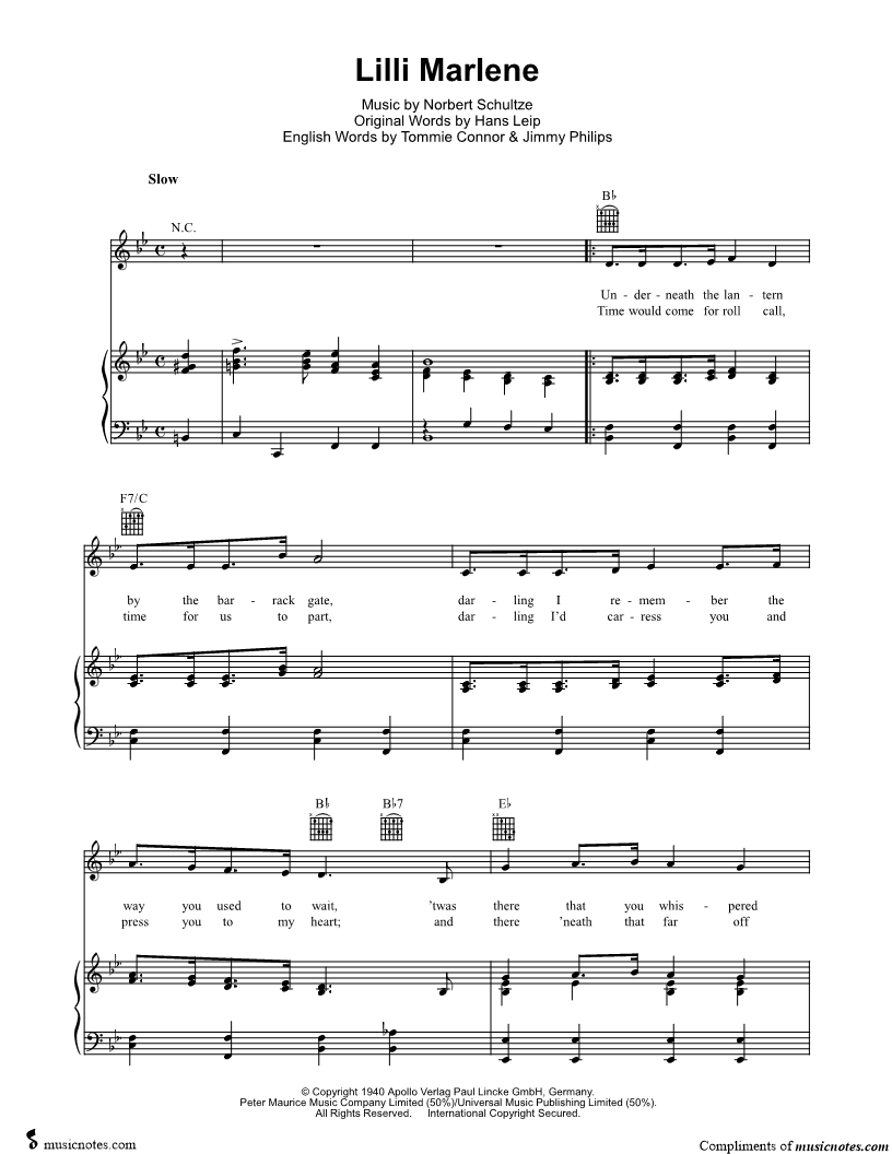 Underneath the lantern by the barrack gate, darling I remember the way you used to wait, 'twas there that you whispered tenderly, that you lov'd me, you'd always be, my Lilli of the lamplight, my own Lilli Marlene. |