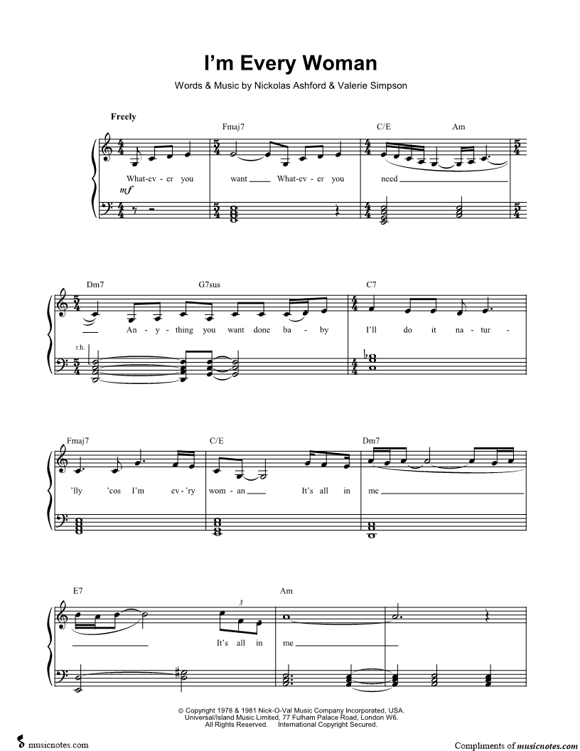 Whatever you want Whatever you need Anything you want done baby I'll do it natur'lly 'cos I'm ev'ry woman It's all in me It's all in me I'm ev'ry woman It's all in me Anything you want done baby I'll do it natur'lly |