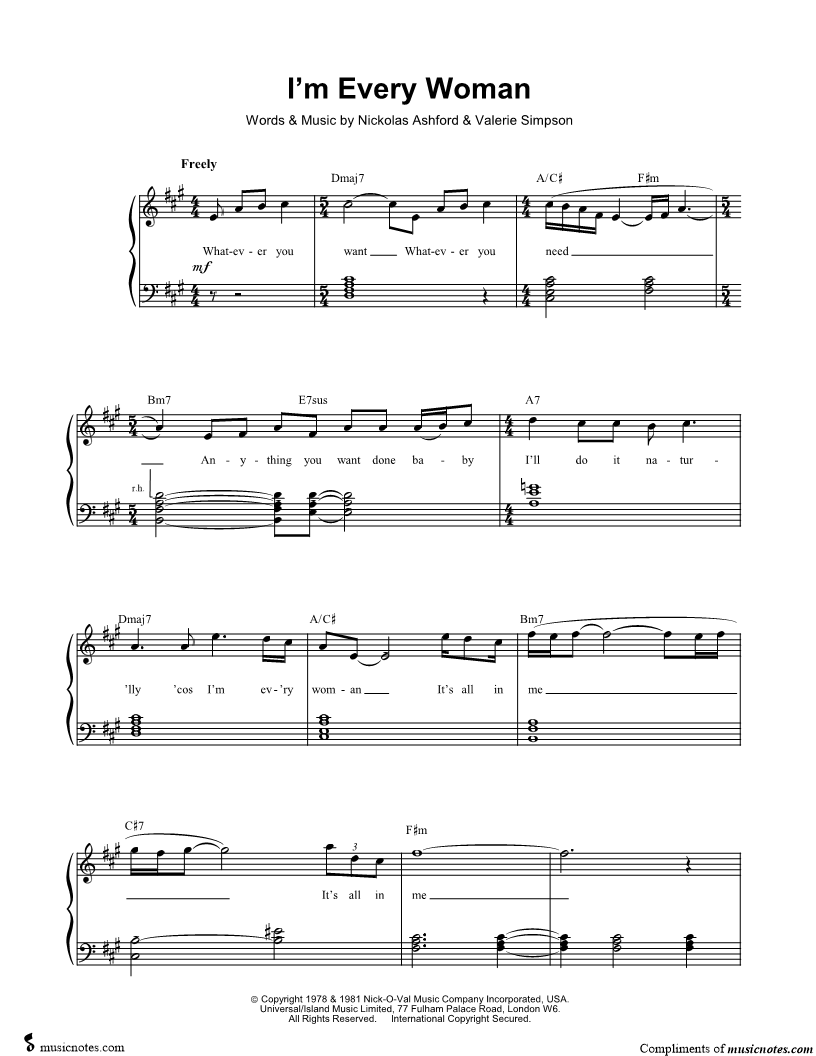 Whatever you want Whatever you need Anything you want done baby I'll do it natur'lly 'cos I'm ev'ry woman It's all in me It's all in me I'm ev'ry woman It's all in me Anything you want done baby I'll do it natur'lly |
