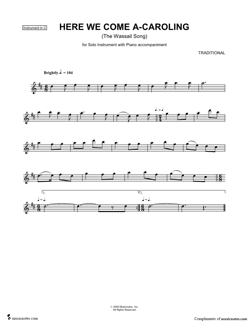 Here We Come A-Caroling - C Instrument & Piano The Wassail Song