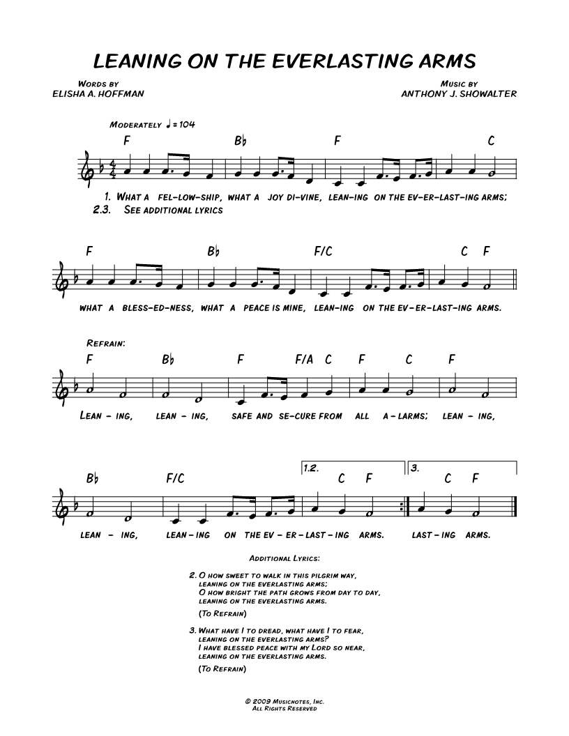 What a fellowship, what a joy divine, leaning on the everlasting arms; what a blessedness, what a peace is mine, leaning on the everlasting arms. |