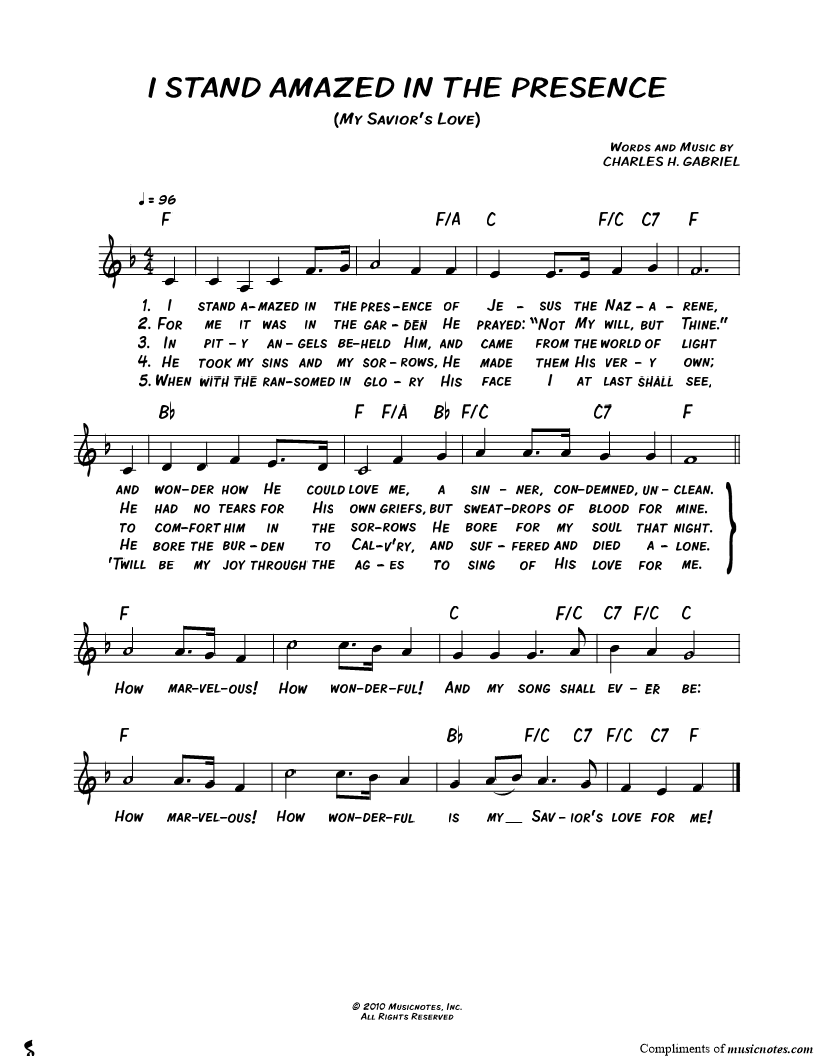 I stand amazed in the presence of Jesus the Nazarene, and wonder how He could love me, a sinner, condemned, unclean. |