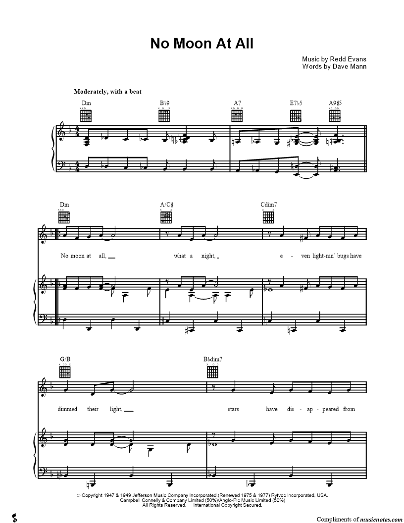 No moon at all, what a night, even lightnin' bugs have dimmed their light, stars have disappeared from sight and there's no moon at all. |