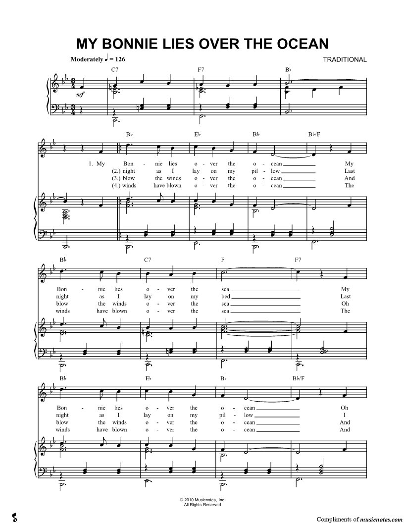 My Bonnie lies over the ocean My Bonnie lies over the sea My Bonnie lies over the ocean Oh bring back my Bonnie to me. |