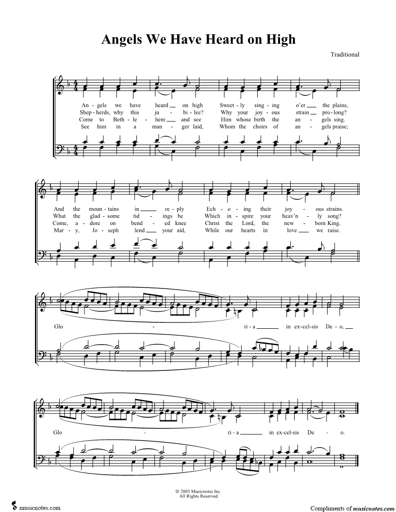 Angels we have heard on high Sweetly singing o'er the plains, |