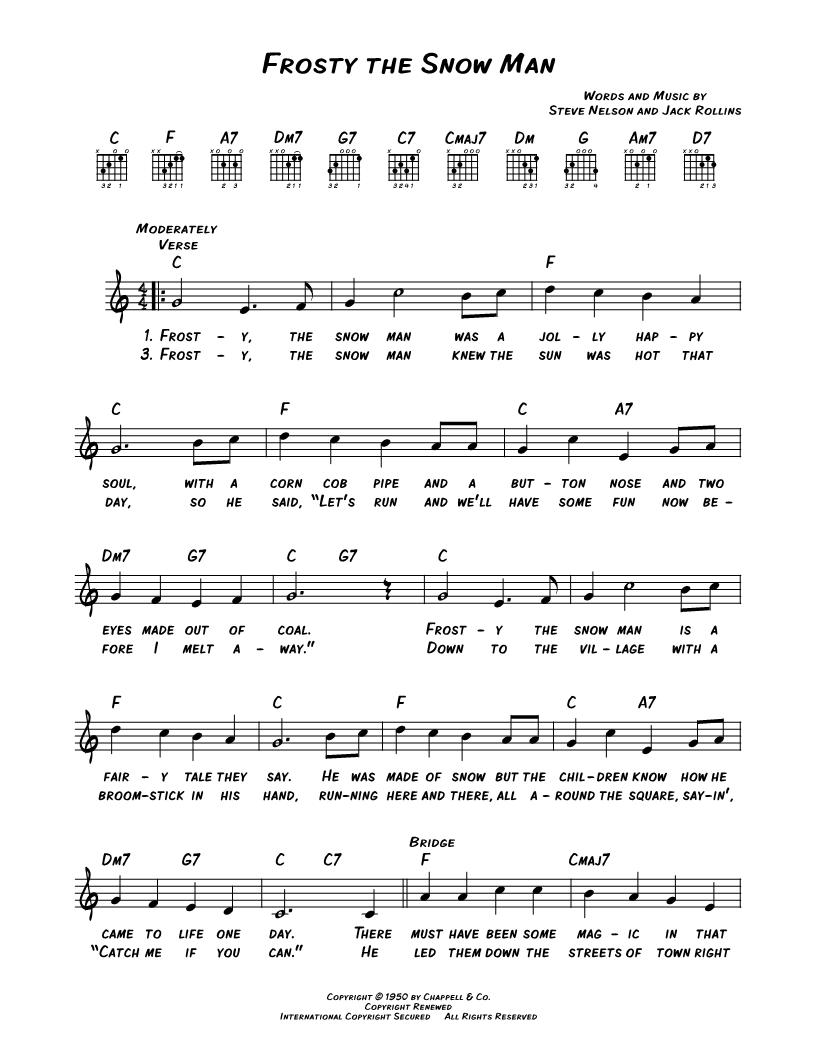 Frosty, the snow man was a jolly happy soul, with a corn cob pipe and a button nose and two eyes made out of coal. |