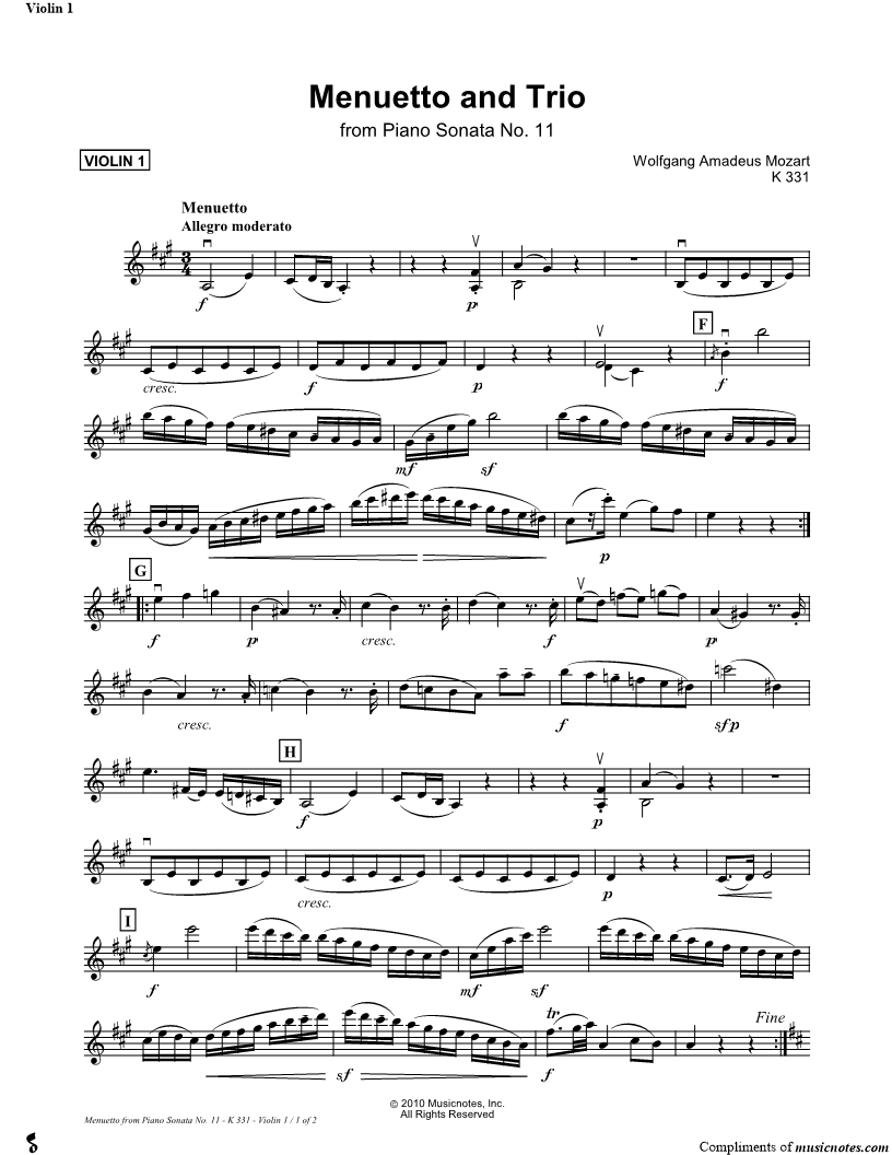 Menuetto and Trio from Piano Sonata No. 11, K 331 - Violin (Part 1) |