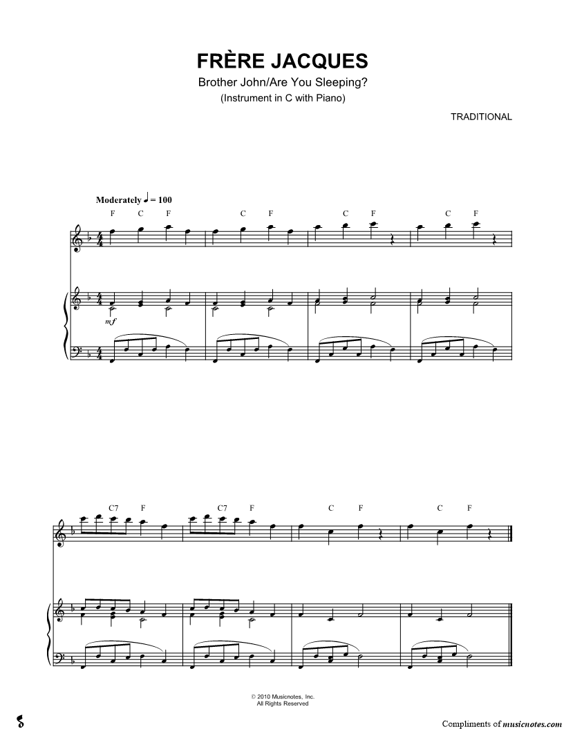 Frère Jacques - C Instrument & Piano Are You Sleeping, Brother John