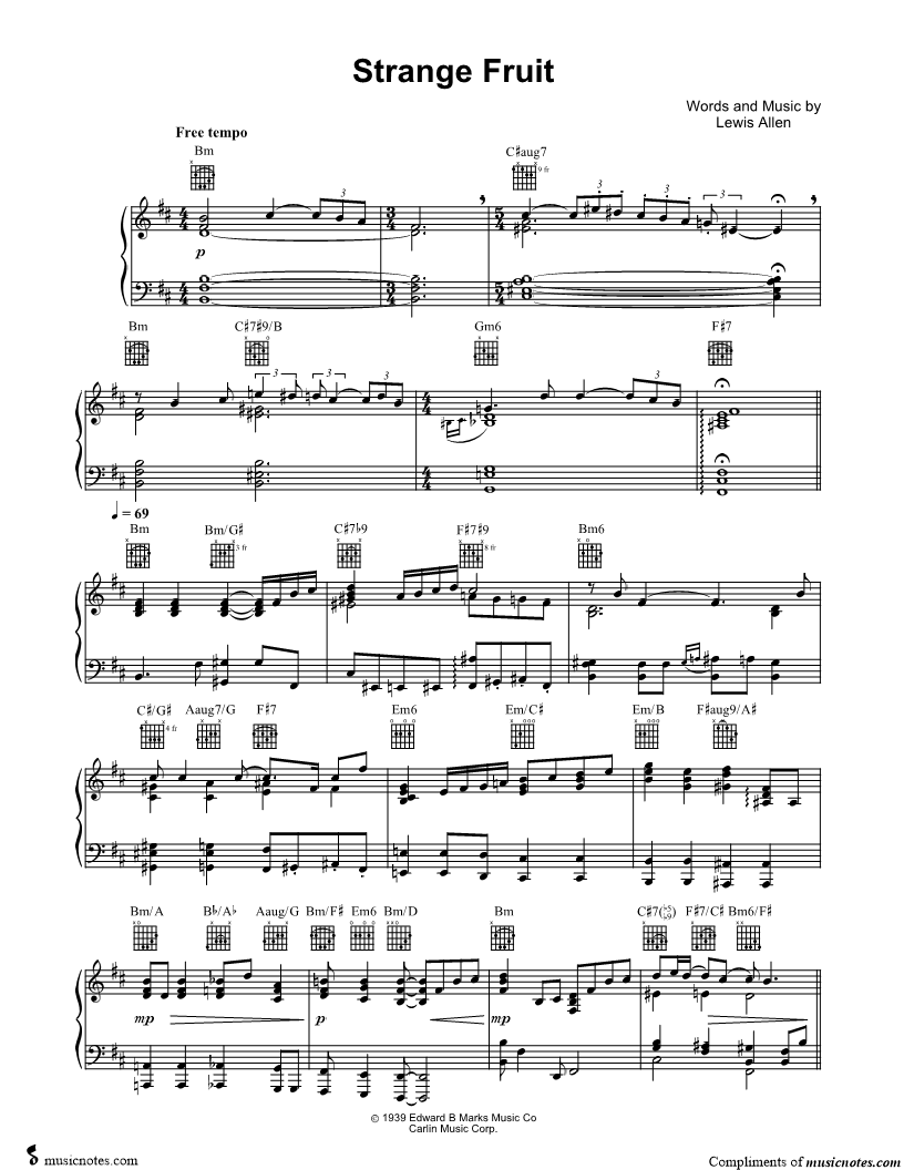 Southern trees bear a strange fruit, blood on the leaves and blood at the root, black bodies swing ing in the southern breeze, strange fruit hanging from the poplar trees. |