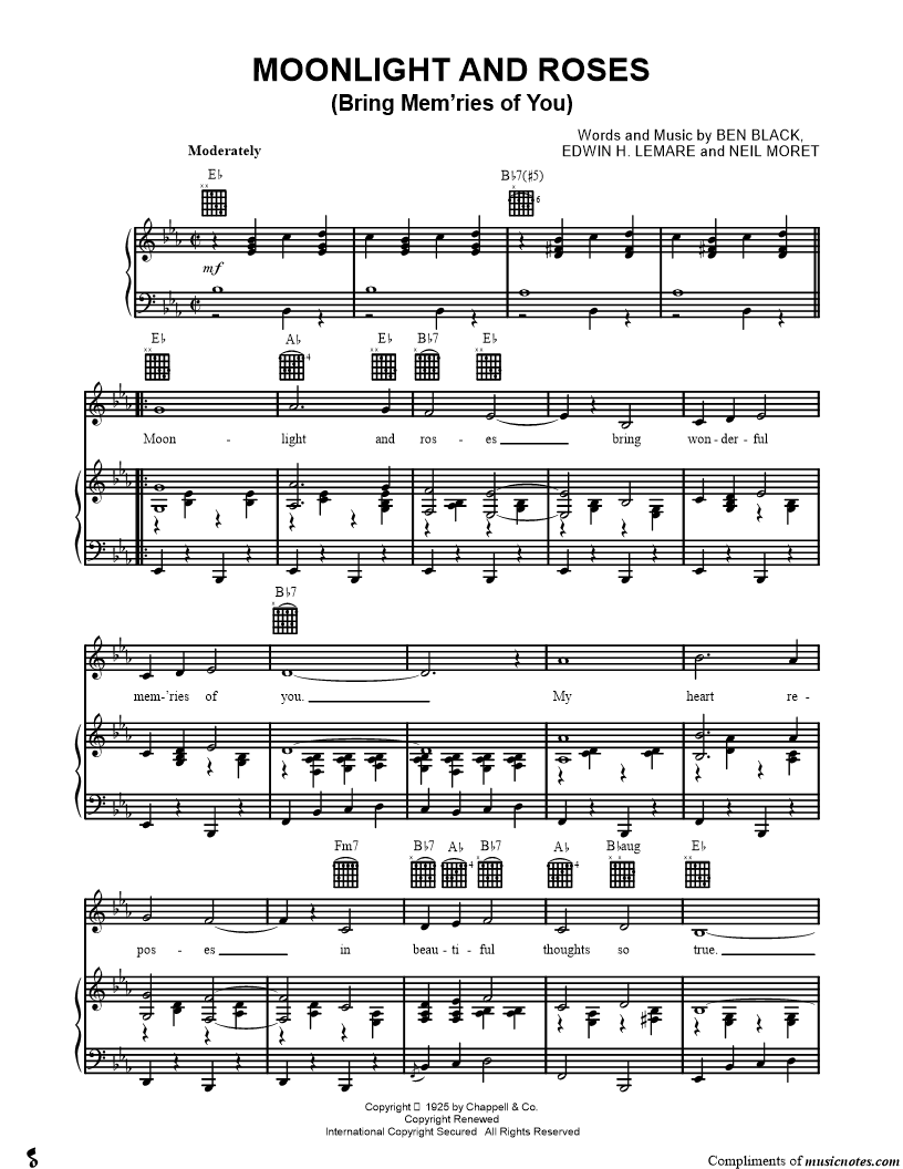 Moonlight and roses bring wonderful mem'ries of you. |