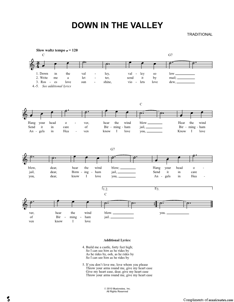Down in the valley, valley so low Hang your head over, hear the wind blow Hear the wind blow, dear, hear the wind blow; |