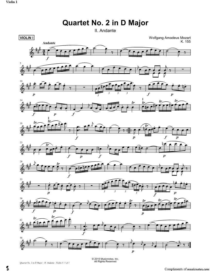 Quartet No. 2 In D Major, K. 155: II. Andante - Violin Part 1 (String Quartet) |