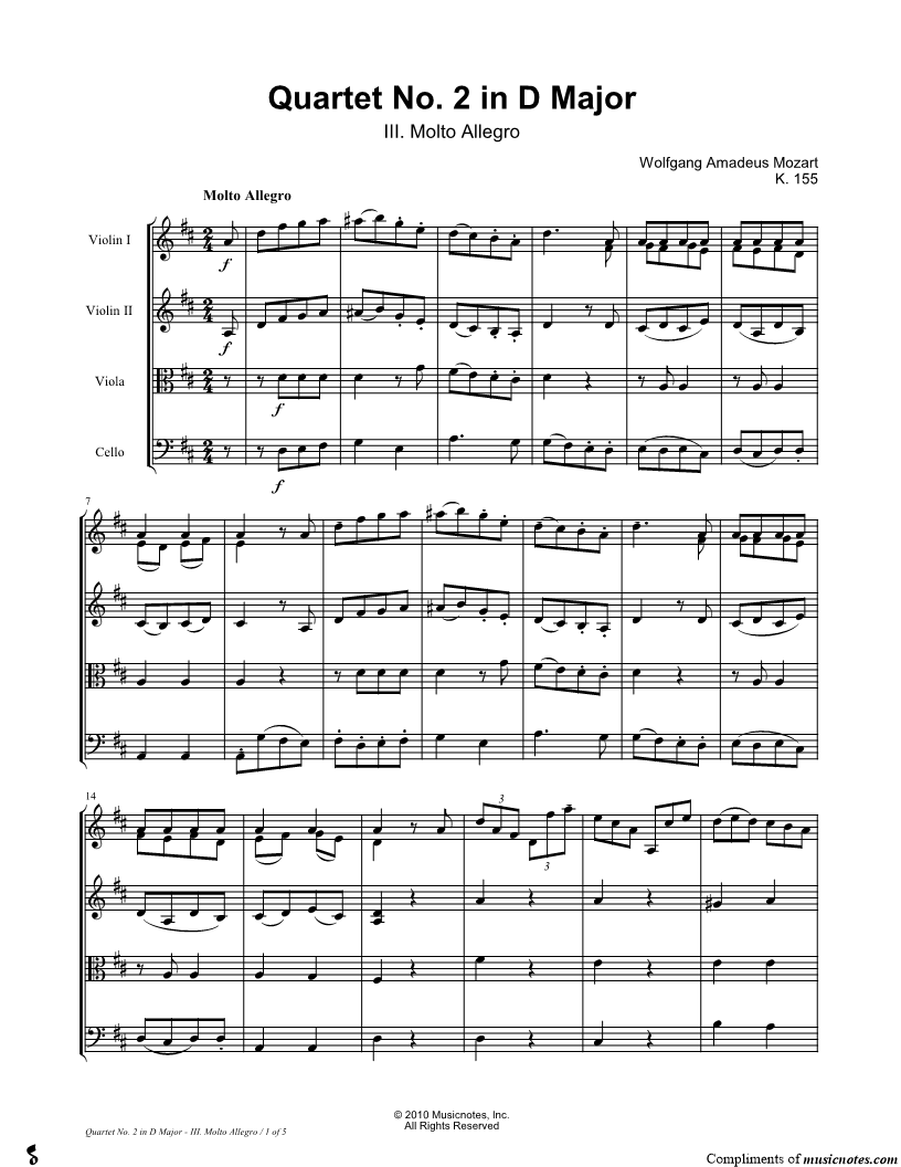 Quartet No. 2 In D Major, K. 155: III. Molto Allegro - Score (String Quartet) |