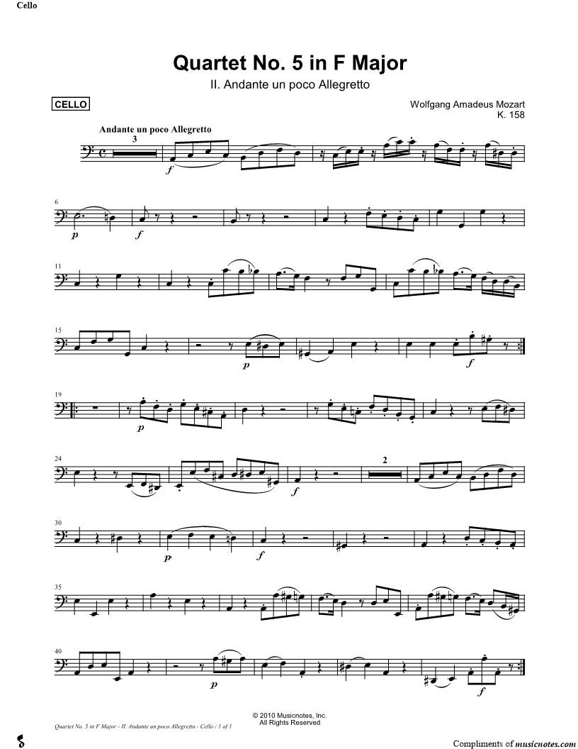 Quartet No. 5 In F Major, K. 158: II. Andante Un Poco Allegretto - Cello Part (String Quartet) |