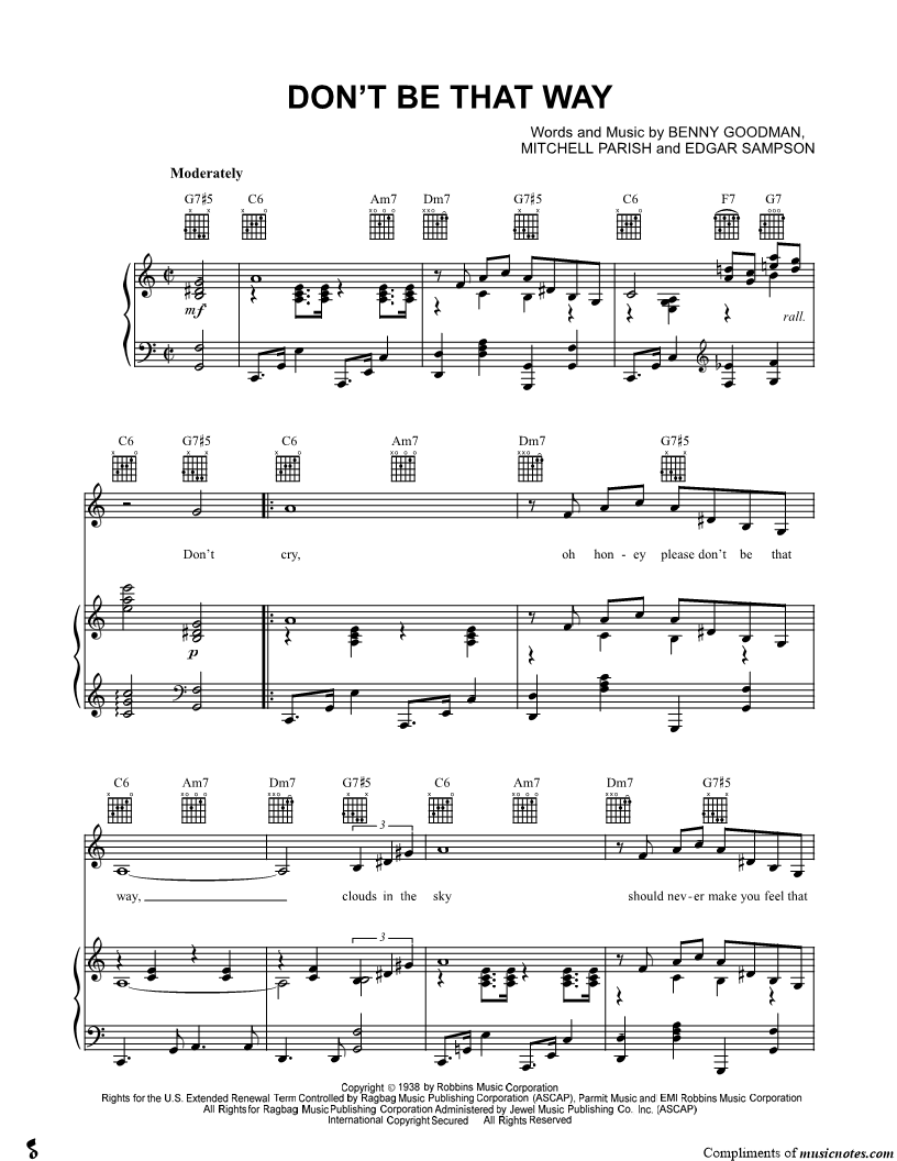 Don't cry, oh honey please don't be that way, clouds in the sky should never make you feel that way, the rain will bring the violets of May, tears are in vain, so honey, please don't be that way, as long as we see it t |