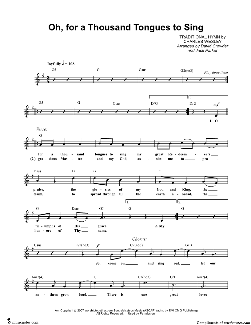 O for a thousand tongues to sing my great Redeemer's praise, the glories of my God and King, the triumphs of His grace. |