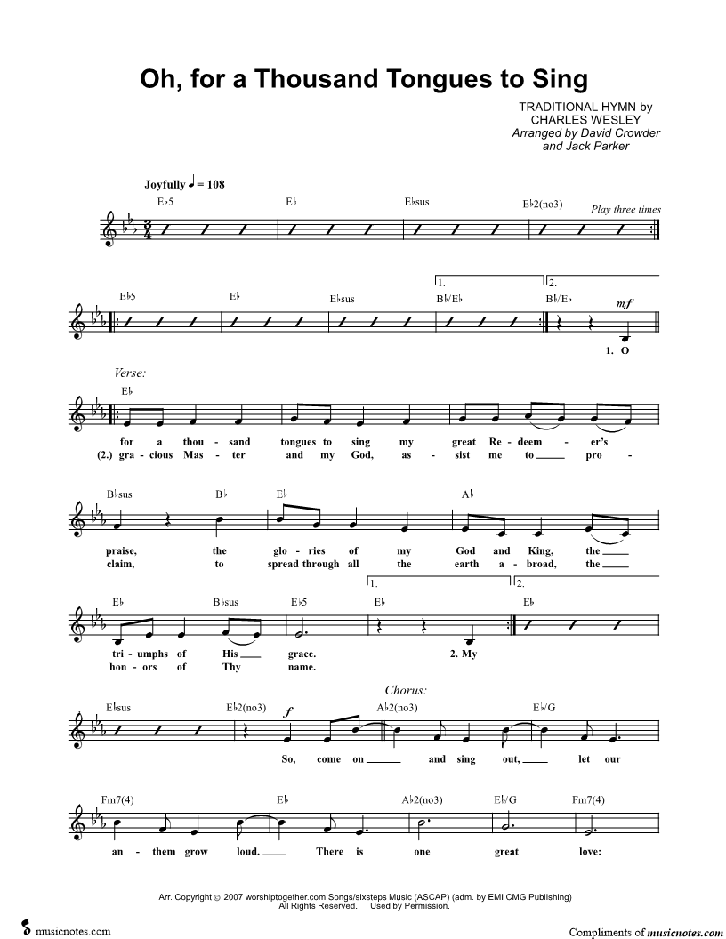 O for a thousand tongues to sing my great Redeemer's praise, the glories of my God and King, the triumphs of His grace. |