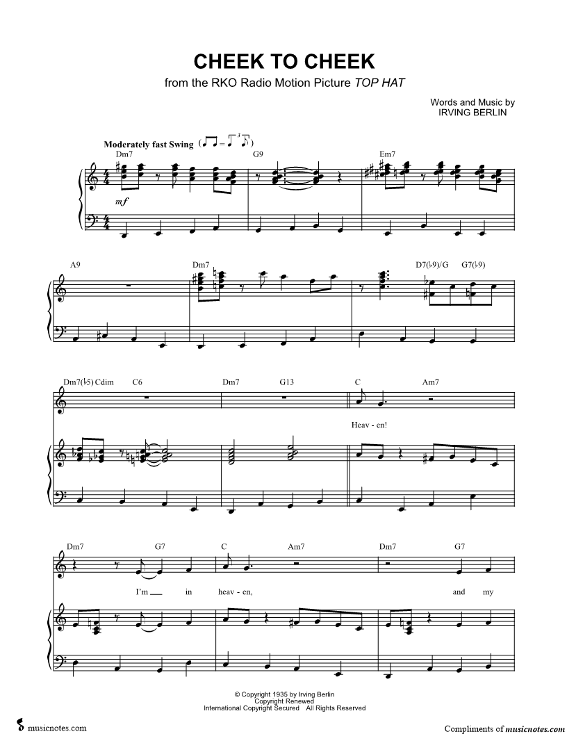 Heaven! I'm in heaven, and my heart beats so that I can hardly speak, and I seem to find that happiness I seek when we're out together dancing cheek to cheek. |