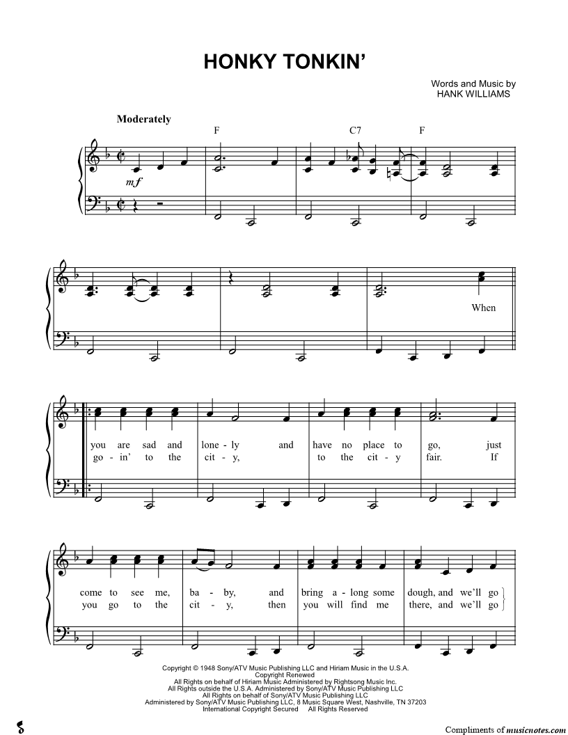 When you are sad and lonely and have no place to go, just come to see me, baby, and bring along some dough, and we'll go honky tonkin', honky tonkin', honky tonkin'. |