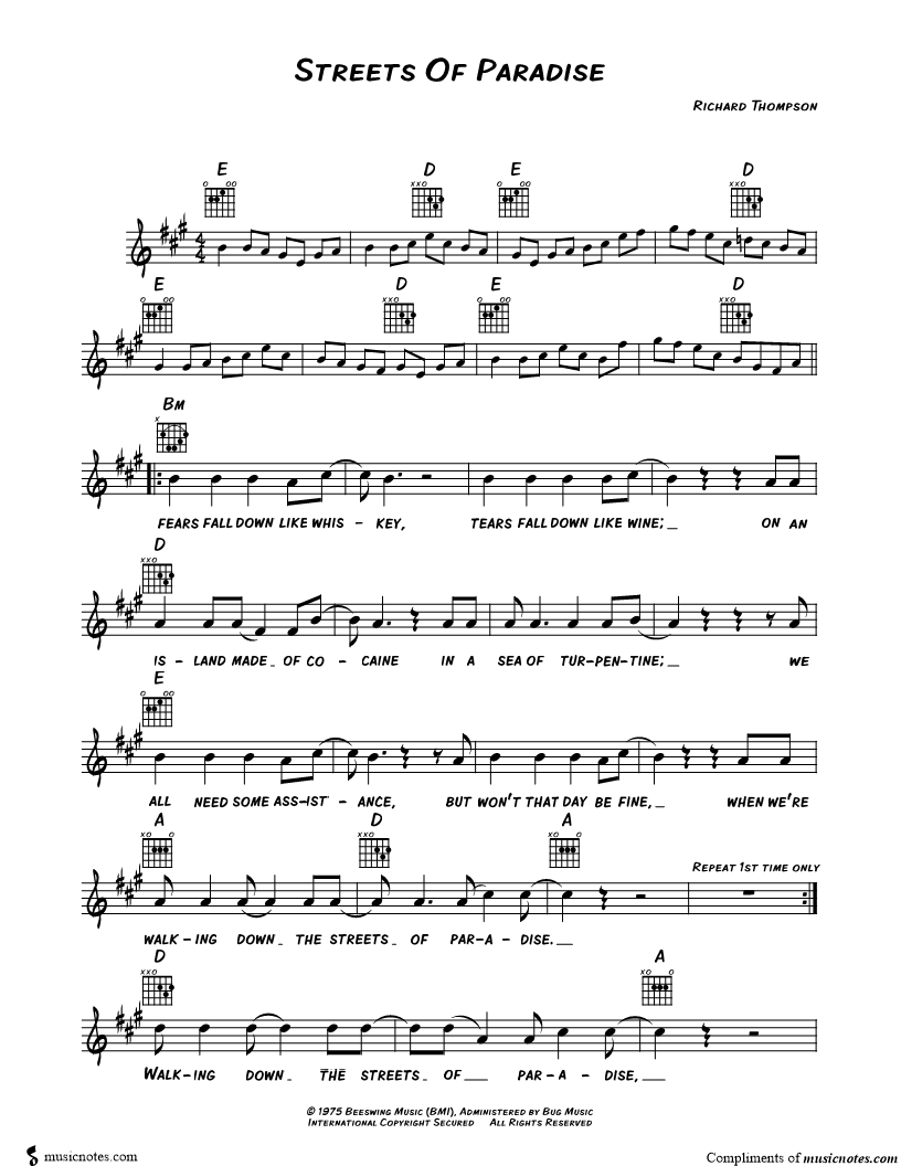 Fears fall down like whiskey, tears fall down like wine; on an island made of cocaine in a sea of turpentine; we all need some assistance, but won't that day be fine, when we're walking down the streets of paradise. |