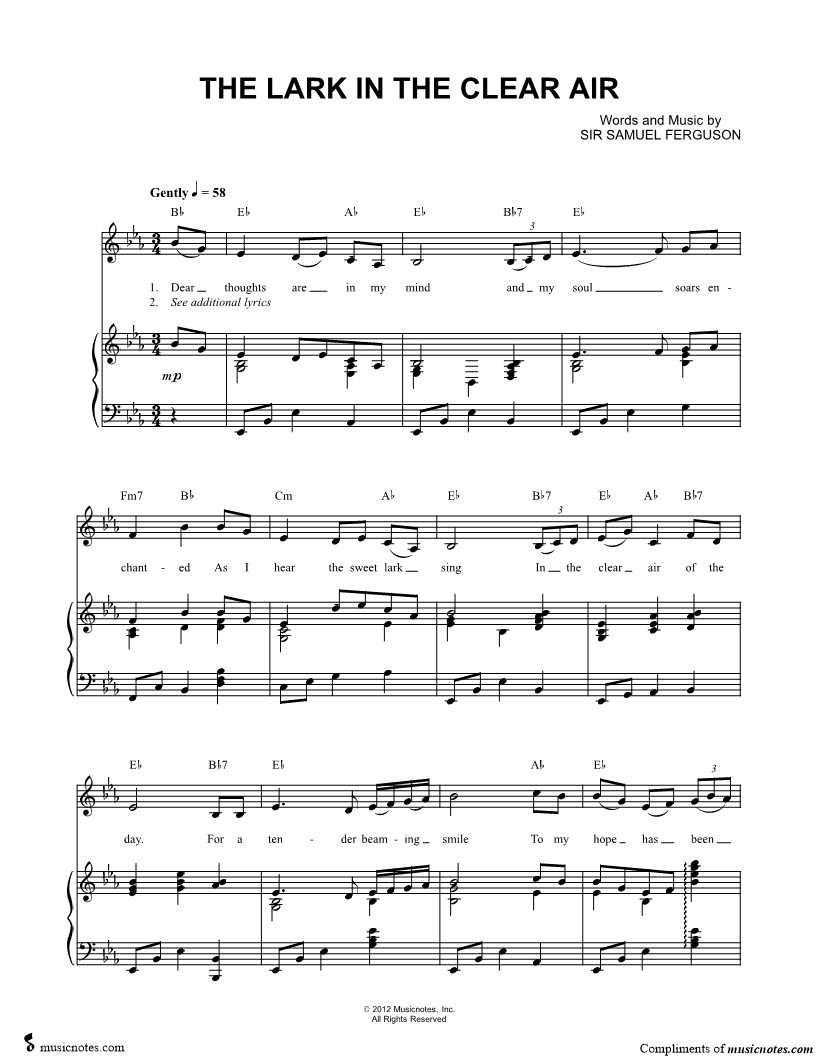 Dear thoughts are in my mind and my soul soars enchanted As I hear the sweet lark sing In the clear air of the day. |
