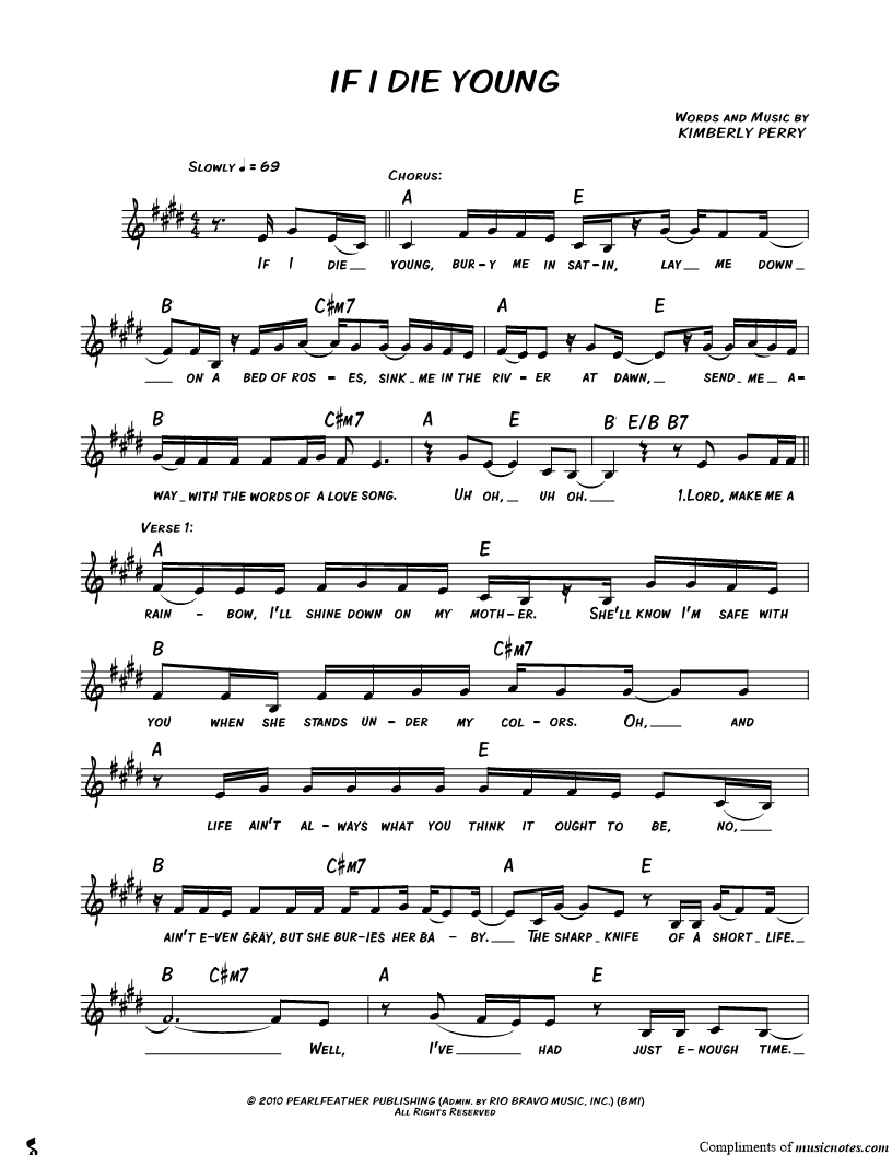 If I die young, bury me in satin, lay me down on a bed of roses, sink me in the river at dawn, send me away with the words of a love song. |