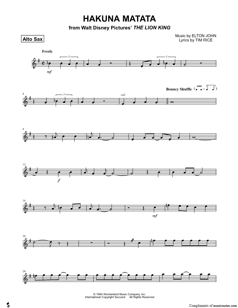 Hakuna Matata - Alto Saxophone & Piano Accompaniment from Walt Disney Pictures' The Lion King