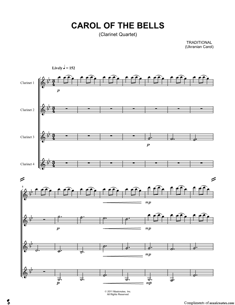 Clarinet 1, range: G4-D6 Clarinet 2, range: A3-Bb5 Clarinet 3, range: G3-G5 Clarinet 4, range: F3-G5 | |