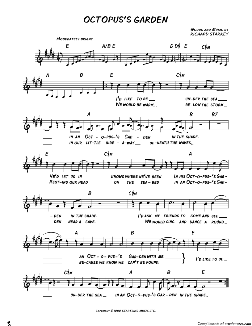 I'd like to be under the sea in an Octopus's Garden in the shade He'd let us in knows where we've been In his Octopus's Garden in the shade. |