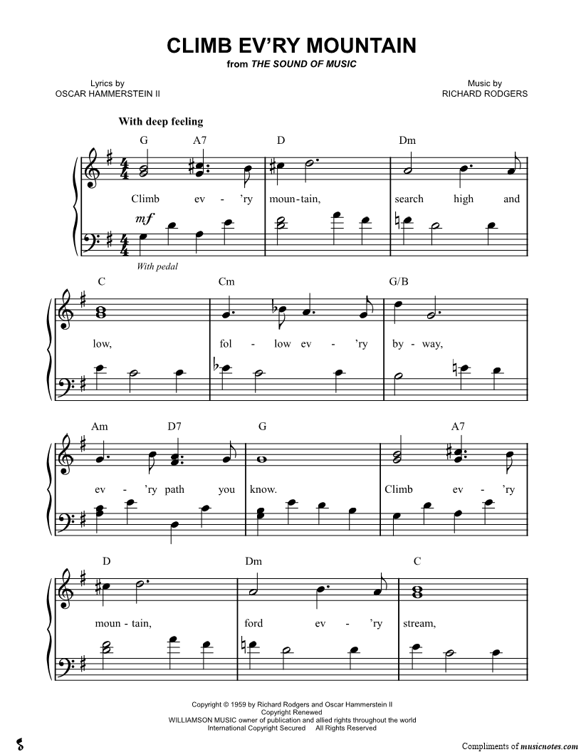 Climb ev'ry mountain, search high and low, follow ev'ry byway, ev'ry path you know. |