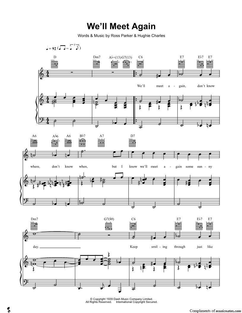 We'll meet again, don't know where, don't know when, but I know we'll meet again some sunny day. |