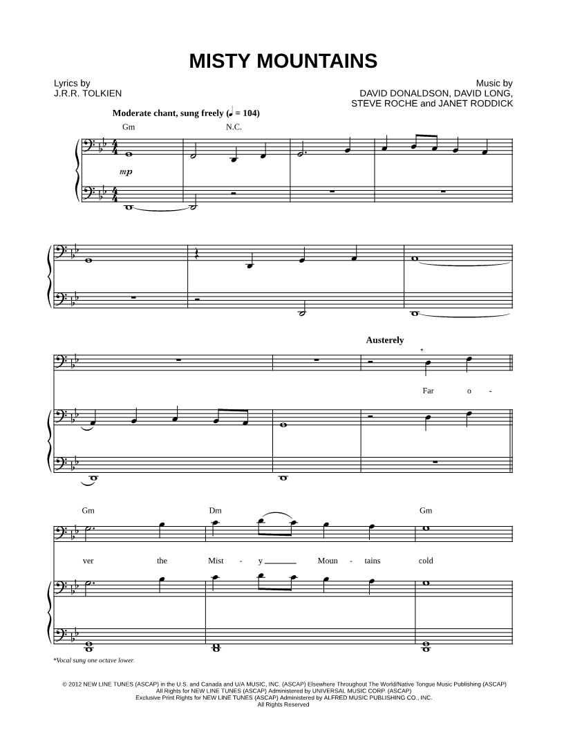 Far over the Misty Mountains cold to dungeons deep and caverns old, we must away ere break of day to find our longforgotten gold. |