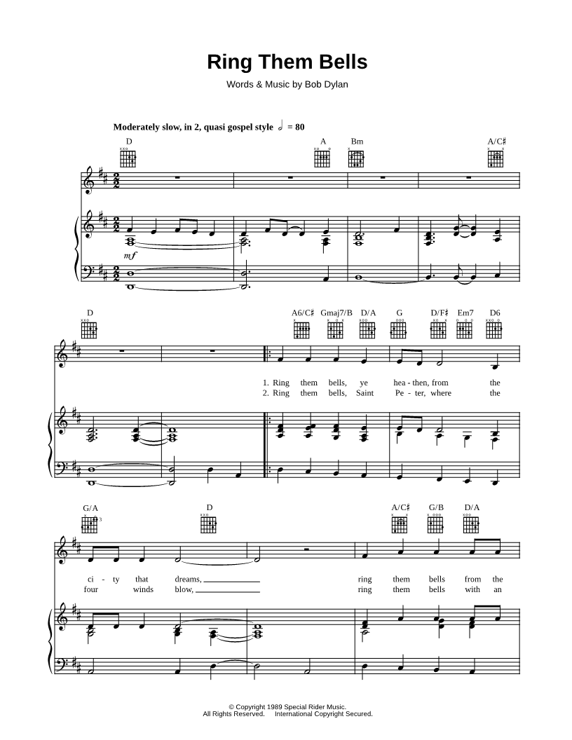 Ring them bells, ye heathen, from the city that dreams, ring them bells from the sanctuaries cross the valleys and streams, for they're deep and they're wide, and the world's on its side, and time is running backwards, and so it the bride. |