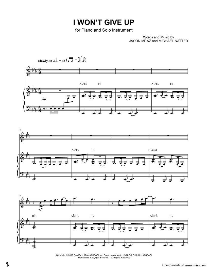 I Won't Give Up - Eb Instrument & Piano
