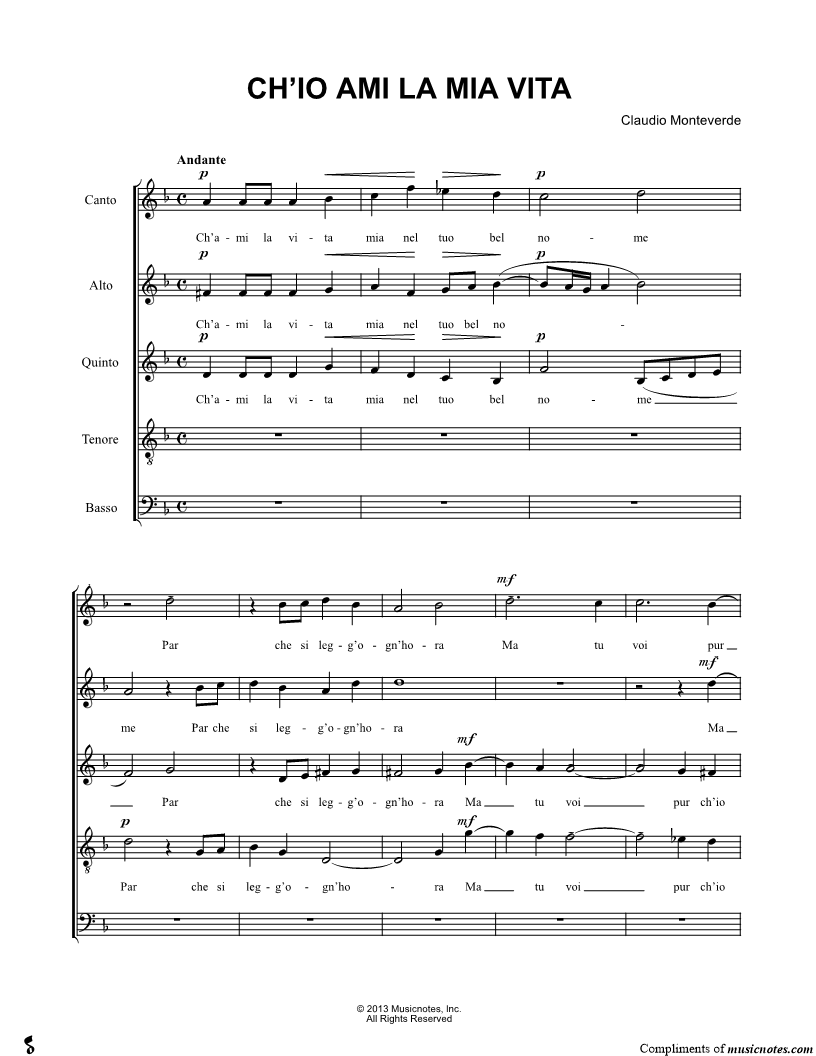Canto, range: F#4-G5 or Soprano Voice Alto Voice, range: D4-Eb5 or Alto Voice Quinto, range: G3-D5 or Alto Voice Tenore, range: D3-A4 or Tenor Voice Basso, range: D3-F4 or Bass Voice SSAATB Choir | |