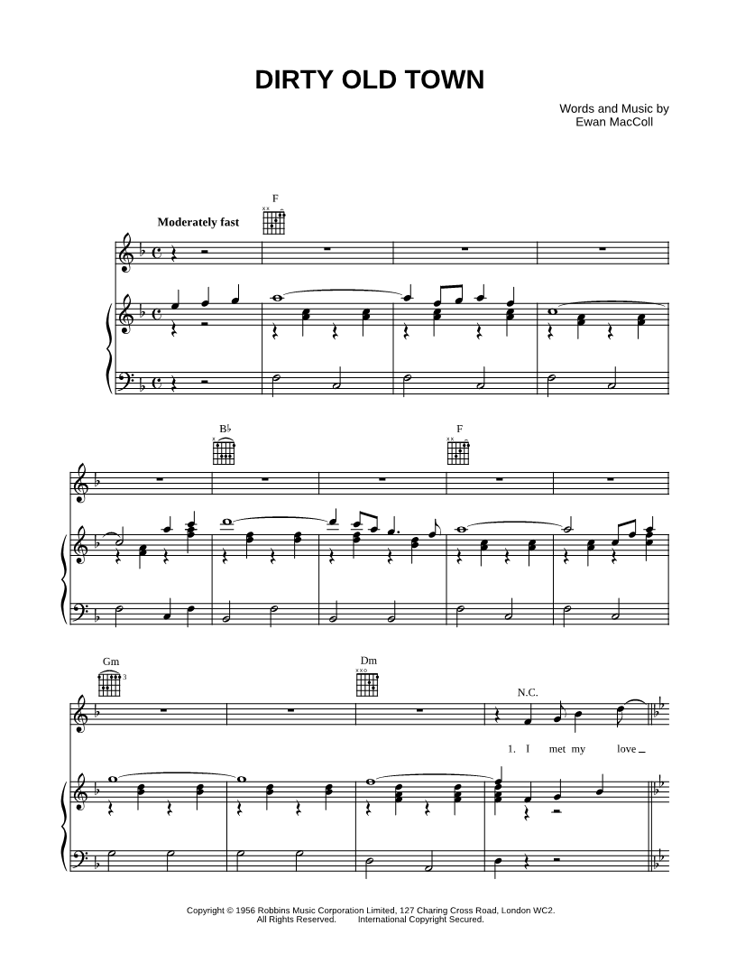 I met my love by the gasworks wall, dreamed a dream by the old canal I kissed my girl by the factory wall, dirty old town, dirty old town. |