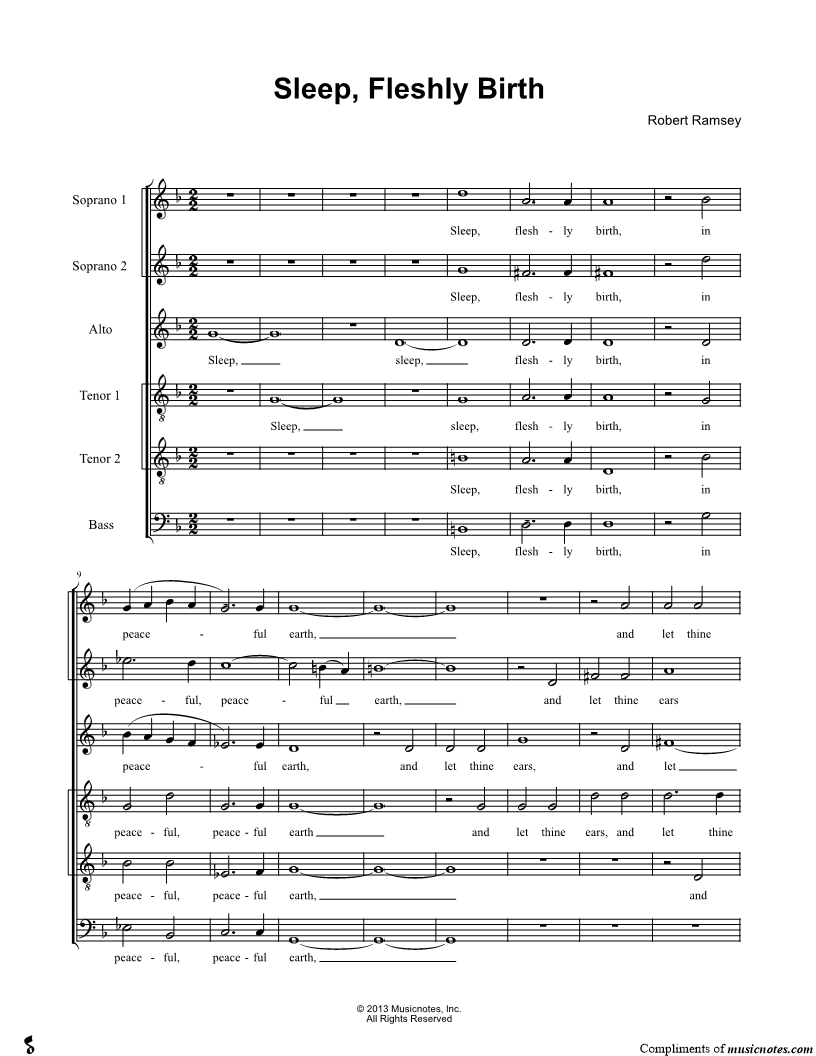 Soprano Voice 1, range: D4-G5 Soprano Voice 2, range: D4-G5 Alto Voice, range: G3-C5 Tenor Voice 1, range: F3-G4 Tenor Voice 2, range: C3-G4 Bass Voice, range: G2-A3 | |
