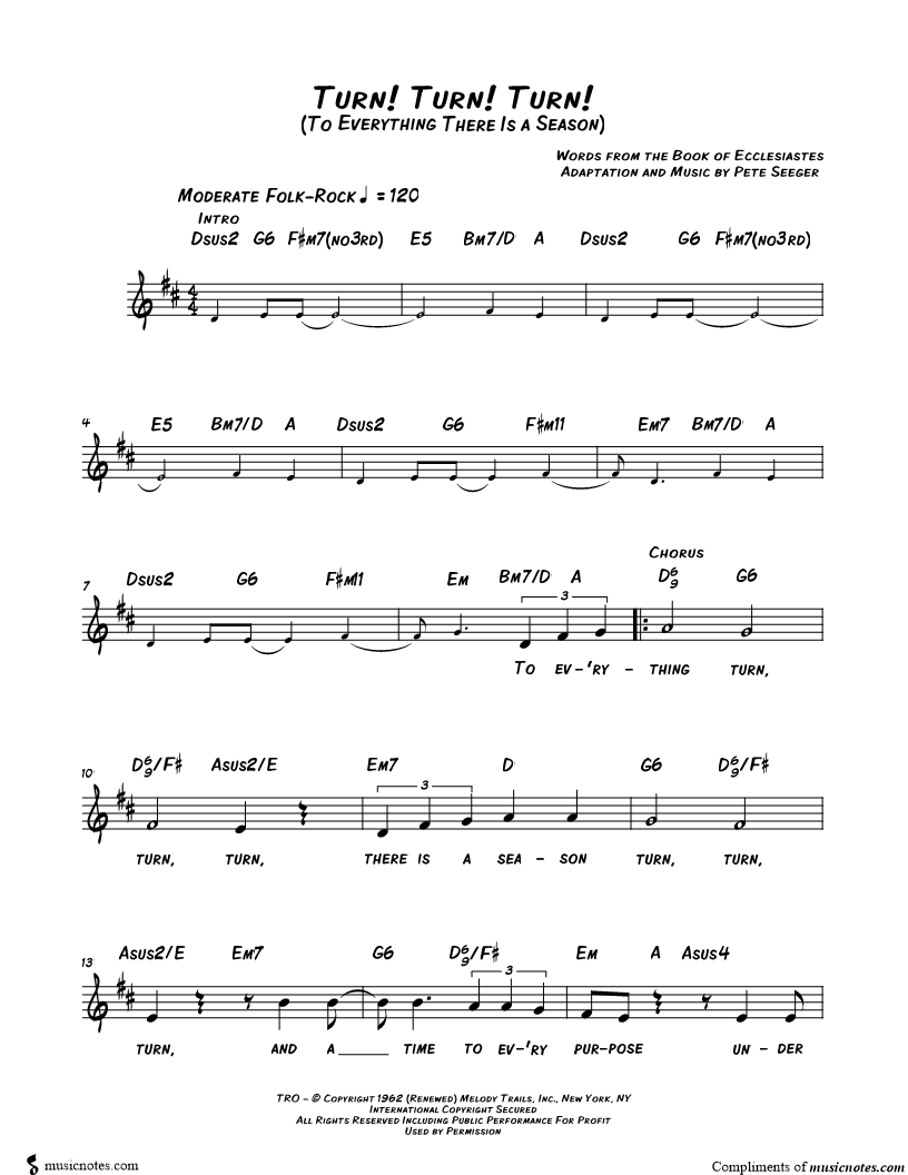 To ev'rything turn, turn, turn, there is a season turn, turn, turn, and a time to ev'ry purpose under A time to be born, a time to die. |